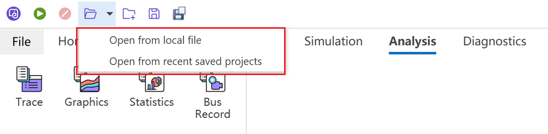 You can eigther click Open from local file to findout the proper project file to load, or click Open from recent saved projects to choose an recent used project to load:
