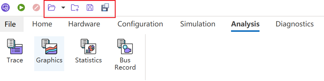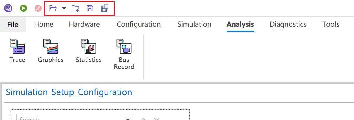 From left to right, there are Open, New, Save and Save As which are consistent with the functionaility in file menu.