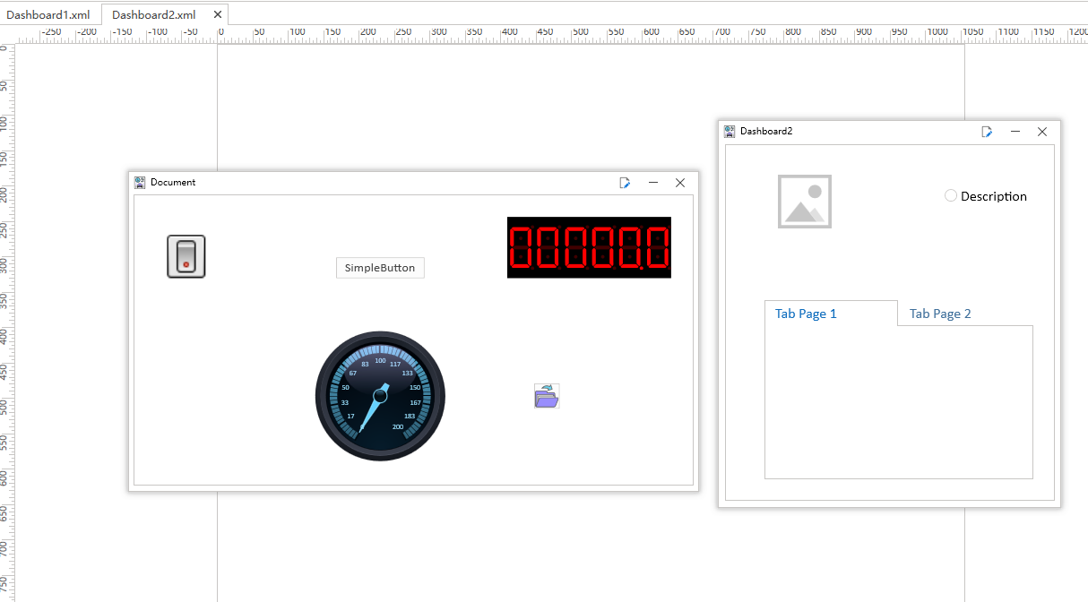 The Working Area window can be edited by Dashboards. When creating or opening multiple Dashboards, the top of the workspace displays the names of all open Dashboards, as shown in Figure.