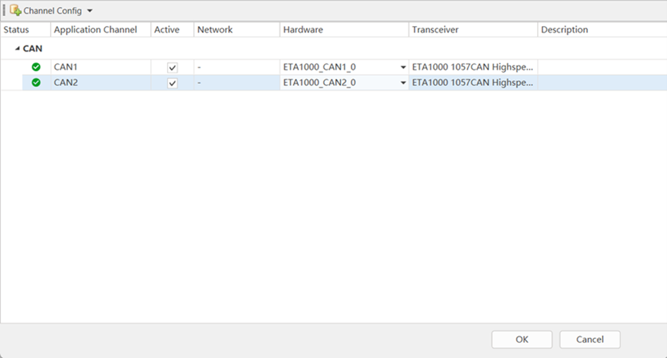 Once the logical channels of the CAN or LIN are selected, they can be associated with the ETA1000 channels, as shown in Figure. In Figure, you can see that ETStudio's logical channel CAN1 is associated with ETA1000's Channel 1, and ETStudio's logical channel CAN2 is associated with ETA1000's Channel 2.