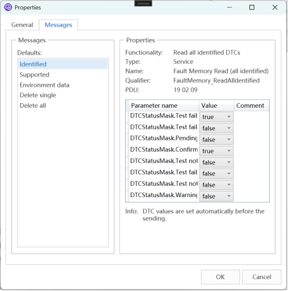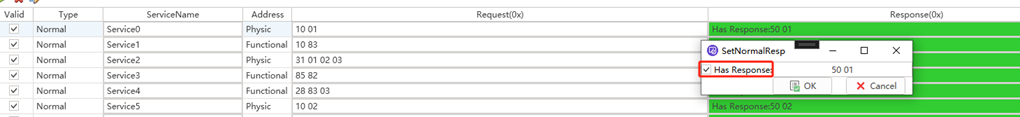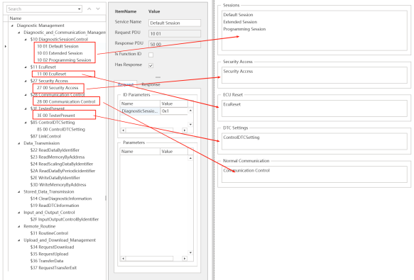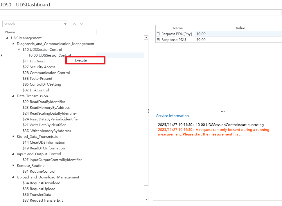 The list of diagnostic requests on the left shows all the diagnostic service requests defined in the current CDD file. Users can trigger a service request by double-clicking on it and view the response results for that request in the Diagnostic Response Results area. If a diagnostic service request involves a write operation, the user can enter the parameter values that need to be written in the diagnostic request settings area, and then execute the request.