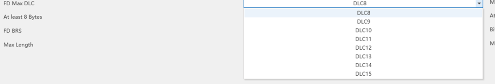 FD Max DLC: When the transport layer is set to CAN FD, the maximum number of bytes that can be transferred in a single frame is 64 bytes (DLC=15), but this parameter is adjustable, and the adjustment range is as shown in the figure below: