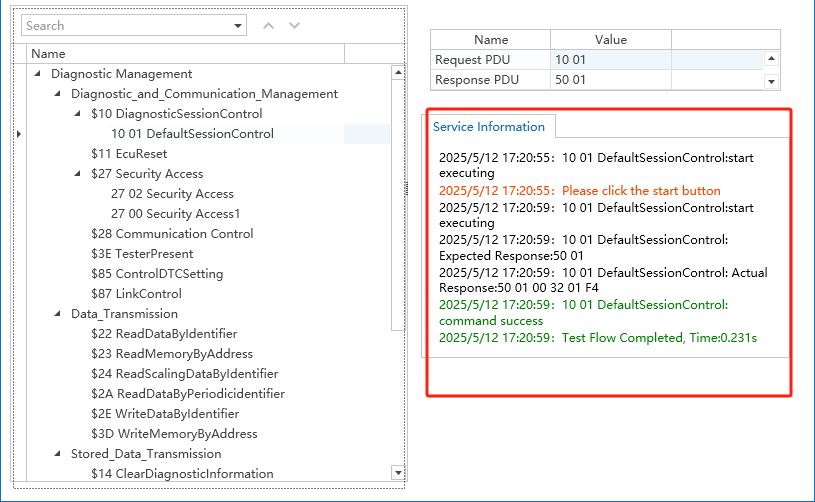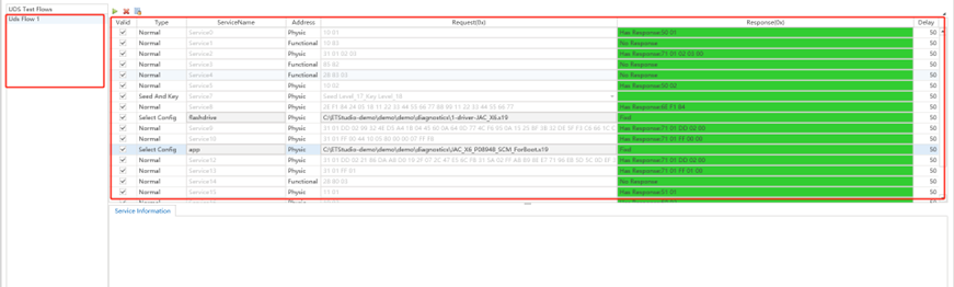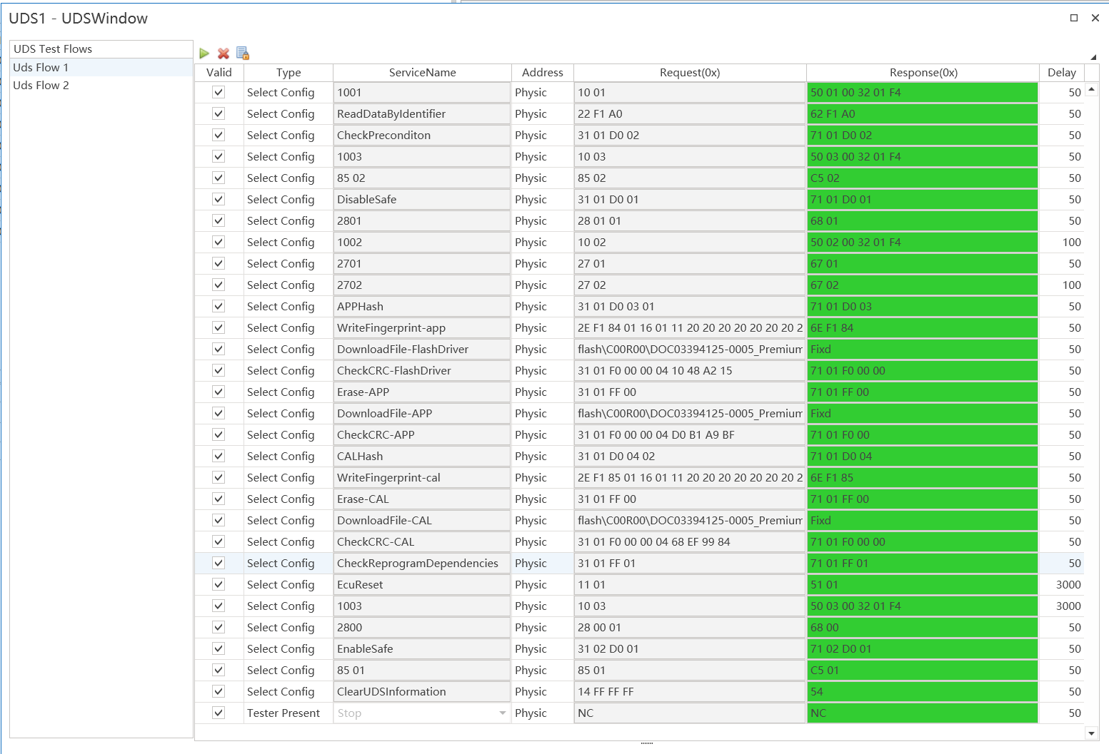 - Start Uds Flow: Initiate the diagnostic process for the selected node. The system will automatically execute the settings on the right dashboard for each diagnostic step based on the pre-configured sequence.