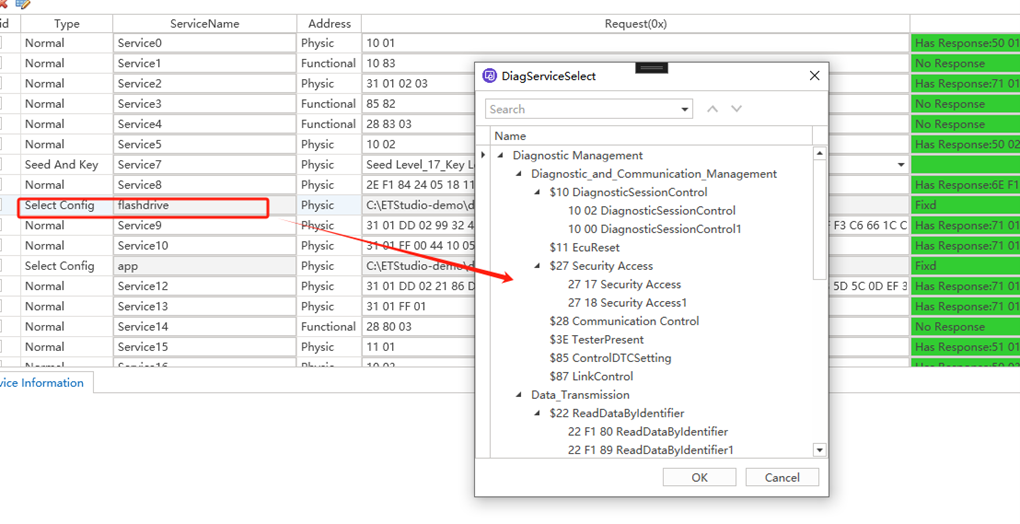 On the ETStudio Basic Diagnostic Configuration page, all the configured session control services will appear on the session control page. Select the specified service, and then double-click to execute the service. For example, to perform an extended session, simply double-click on the extended session.