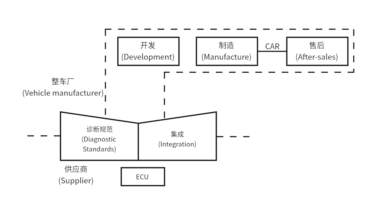 诊断贯穿车辆从开发到售后的整个生命周期,如下图所示:开发阶段整车厂与 ECU 供应商联合定义并开发诊断功能;ECU 供应商对单个 ECU 进行诊断测试,OEM 在生产阶段对整车系统进行诊断测试;车辆下线后,售后维护单位可依据诊断规范使用诊断设备对故障车辆进行排查与维修。