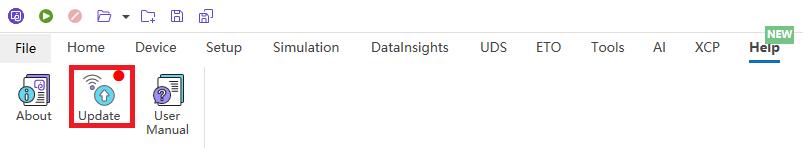 可通过 Help 菜单下的 Update 选项进入软件升级界面;如果检测到有比当前版本更新的软件,会出现“在线更新(Online Update)”提示。