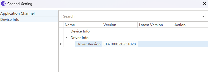 可通过 Channel Setting 的 device info 选项确认当前硬件的固件版本;如果检测到有高于当前固件版本的可用固件,会显示 Update 选项,点击后可进入固件升级确认并执行升级。
