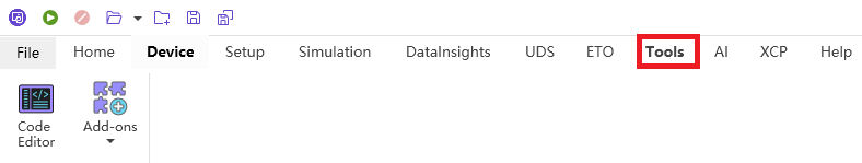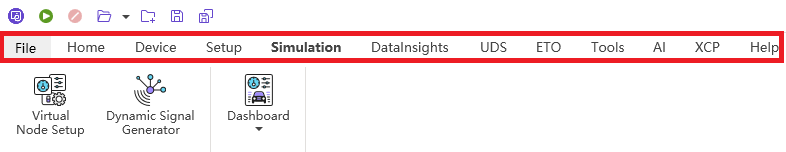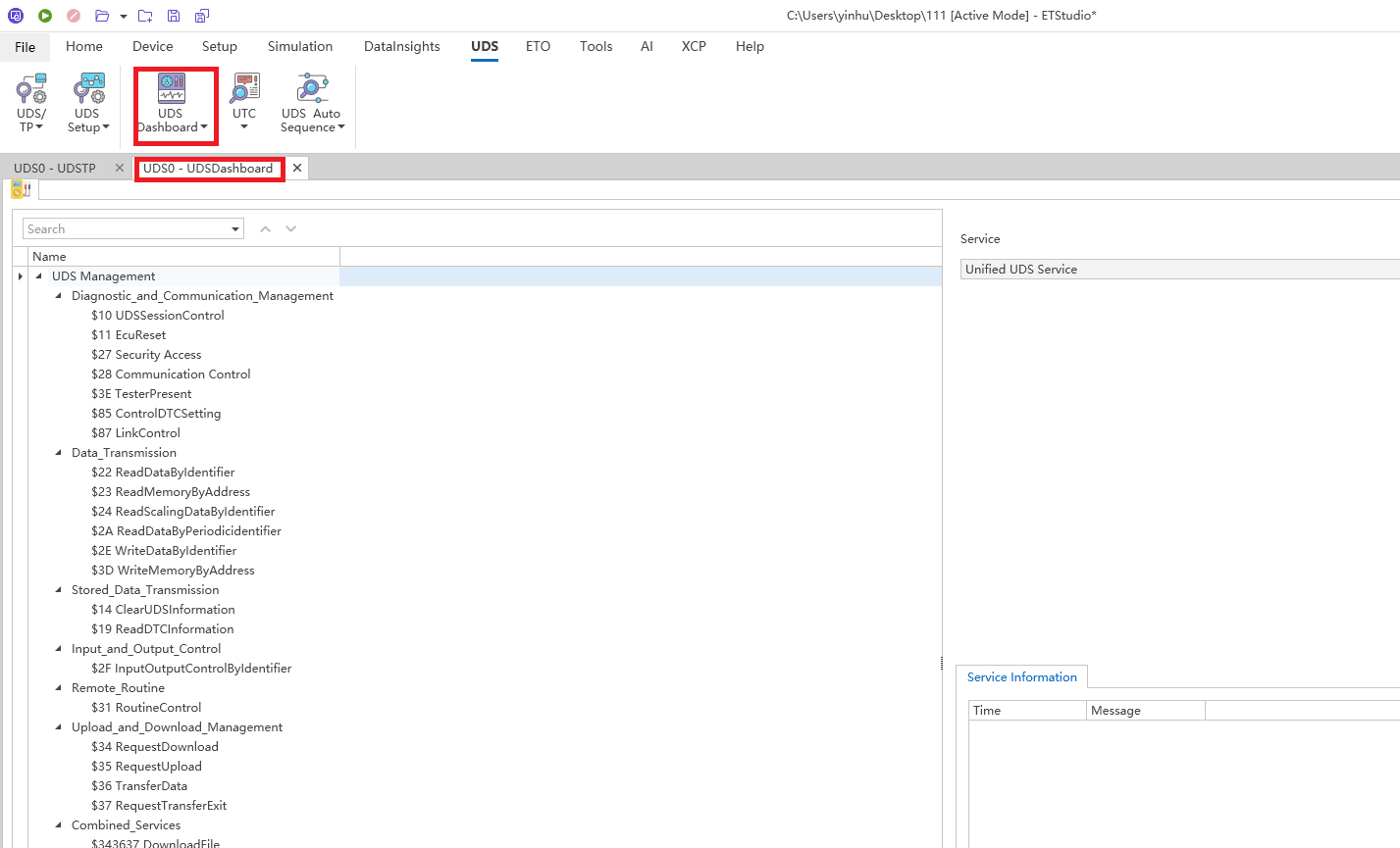UDS 功能区包含与诊断相关的配置组件、控制组件与工具组件。仅在加载相应的诊断配置文件(Profile)到 UDS/TP 后,相关功能项才会可用,否则为灰色不可用状态。