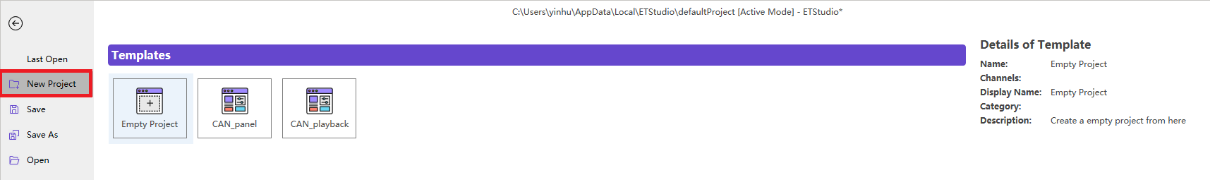 在 ETStudio 界面顶部有默认的快速访问工具栏(包含启动、停止、打开、新建、保存、另存为、选项等)
